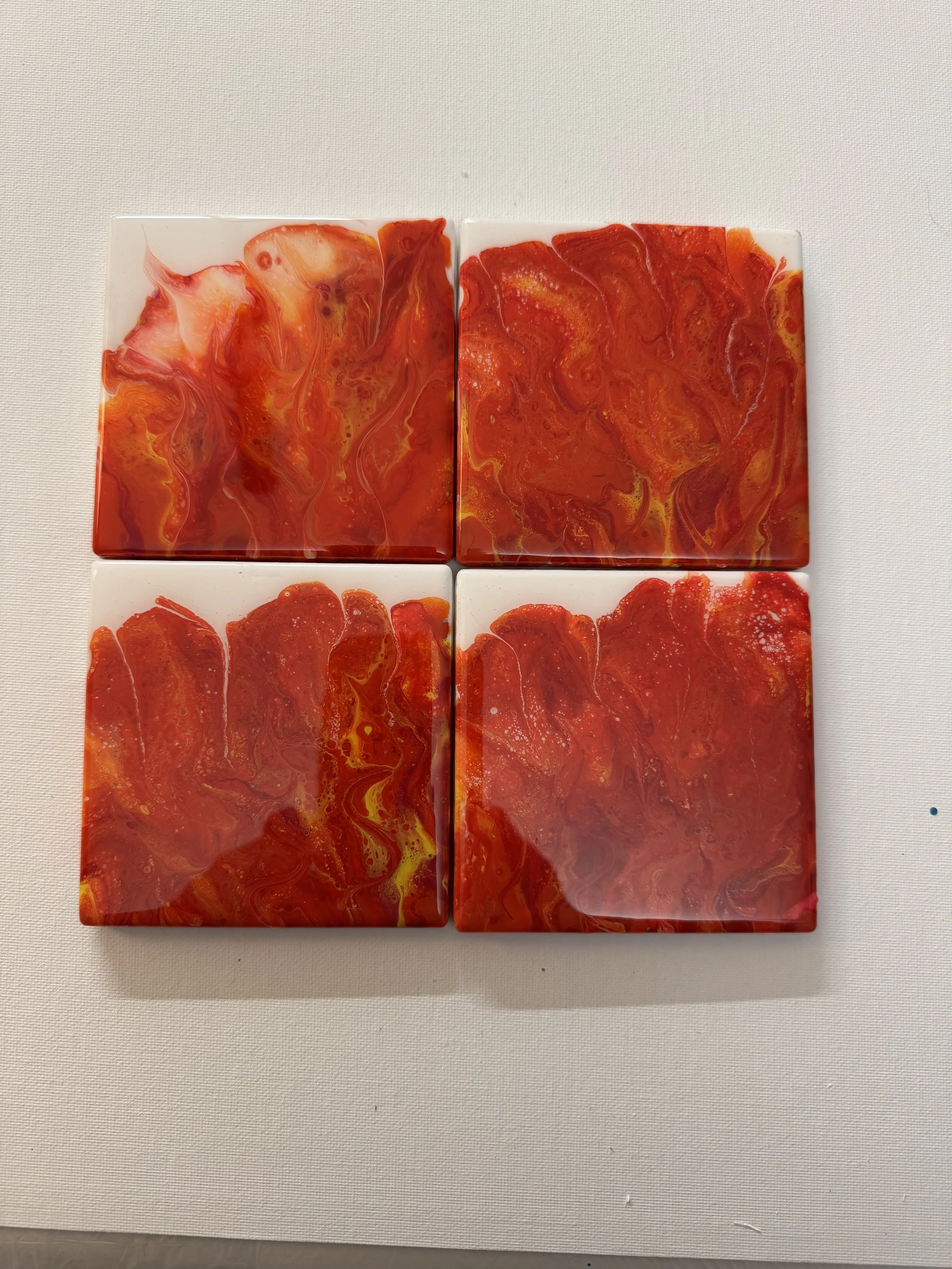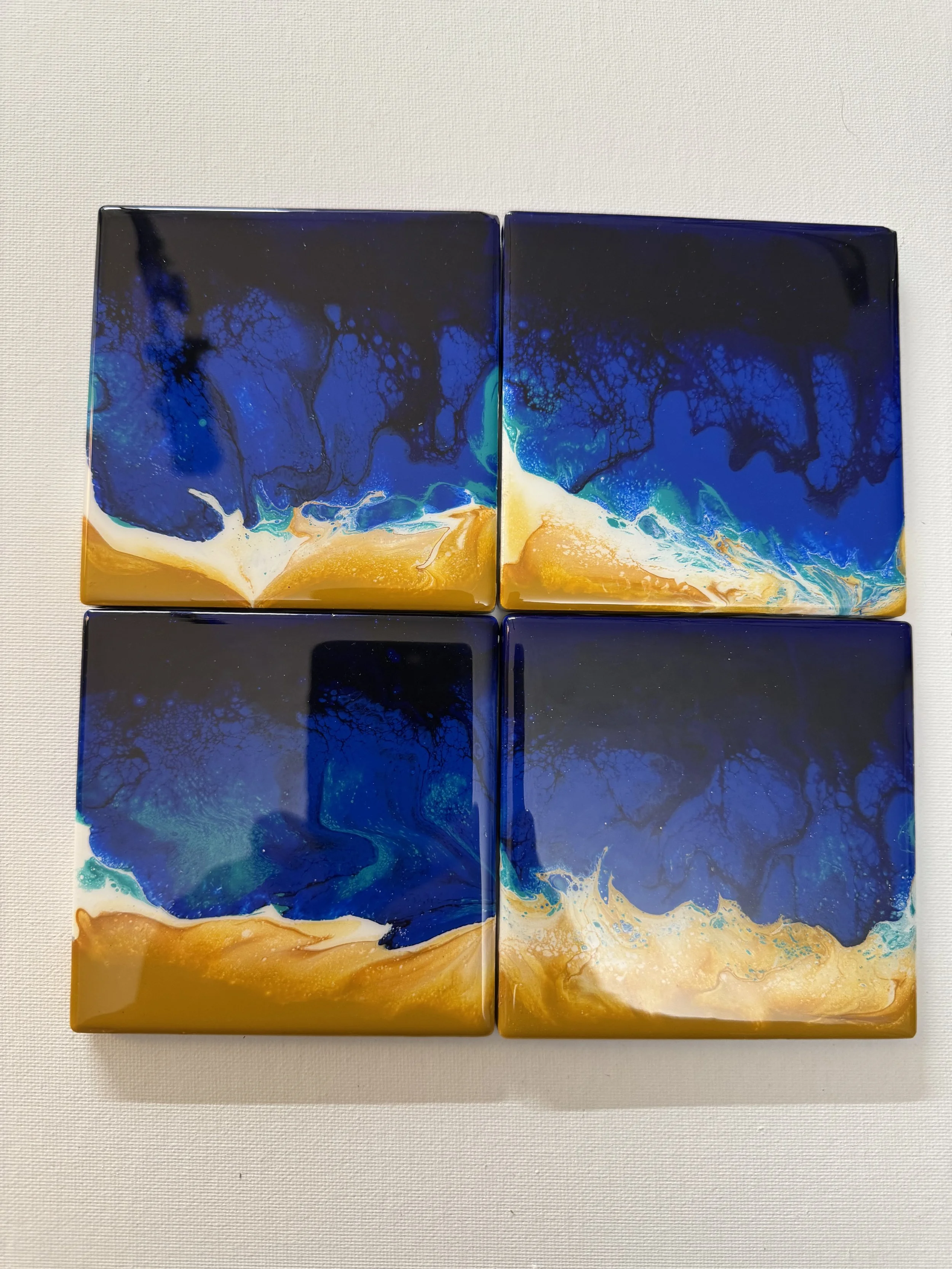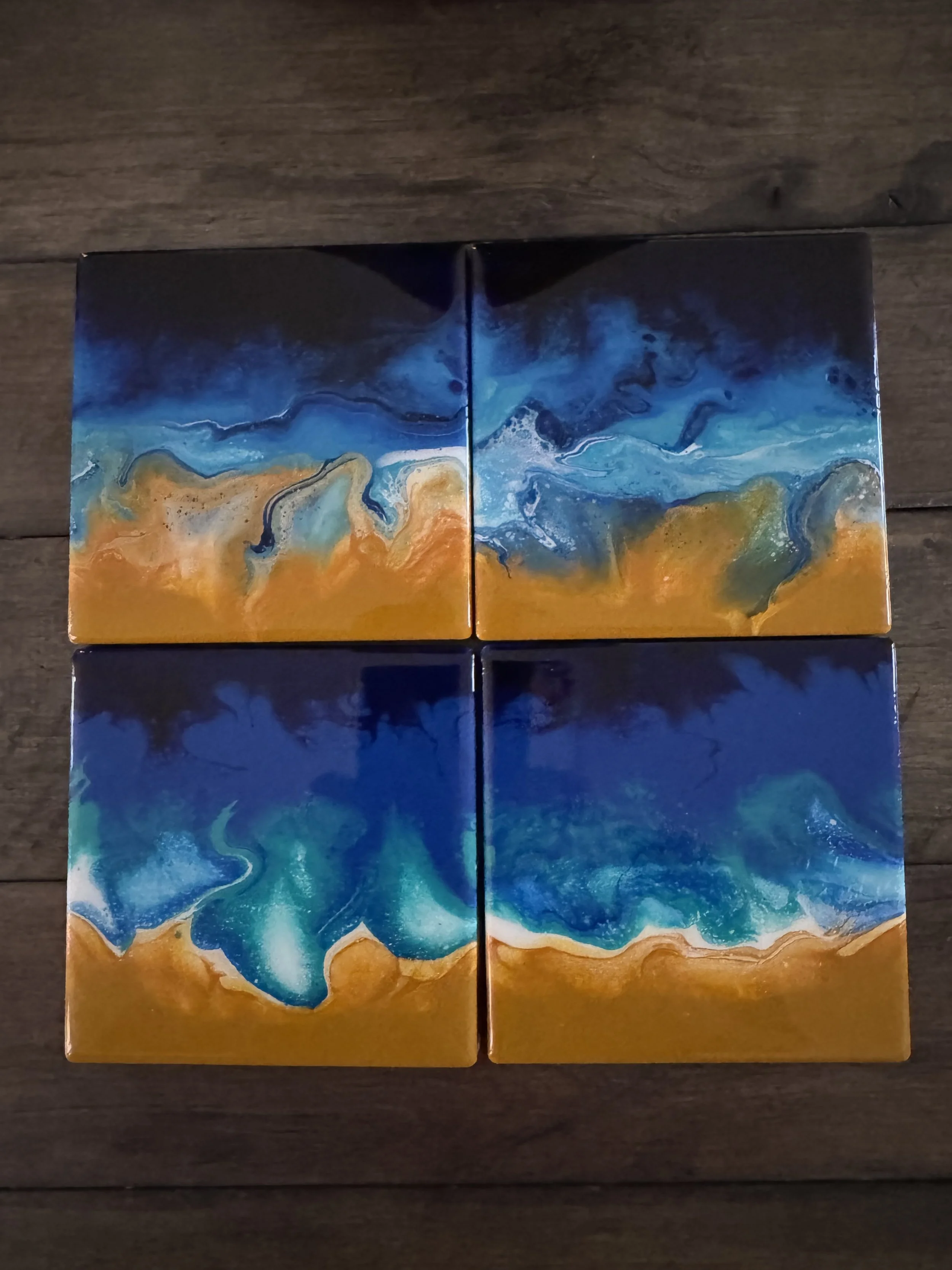 Ceramic coaster set of 4. Hand painted, resin coated, hand polished, cork backing. Each coaster in the set is an original piece of artwork.